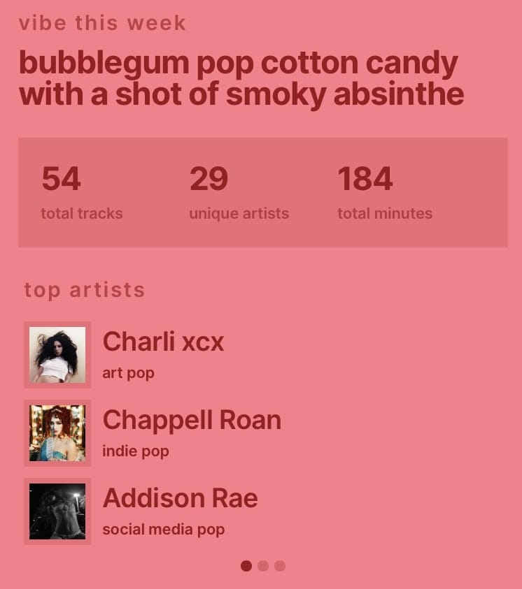 ![]() | Addison Rae making it on my top artists of the week was not on my 2024 bucket list but here we are. Talk to me when you are mature enough to admit that Diet Pepsi is a certified bop. Although I did make my fall playlist, it seems my weekly music vibe is very much still in the summer mood. Feel free to send over your fall playlists as mine is still a work in progress. I tried to not over utilize the kings of fall music (Hozier and Noah Kahan) but I fear I must go back and add more of their songs. |