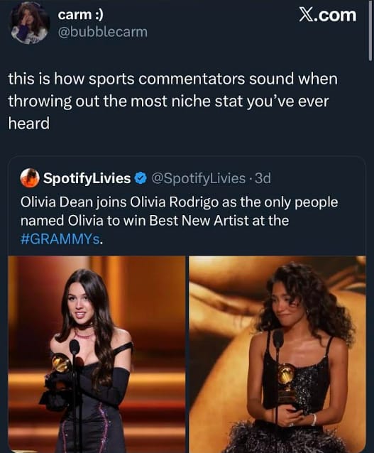 Olivia Dean! My girl! Also, the 2026 Grammy’s Best New Artist. She is already big but I just know she is going to be BIG. Like historically big. Her album, ‘The Art of Loving,’ deserves all the flowers once it is Grammy eligible next year.